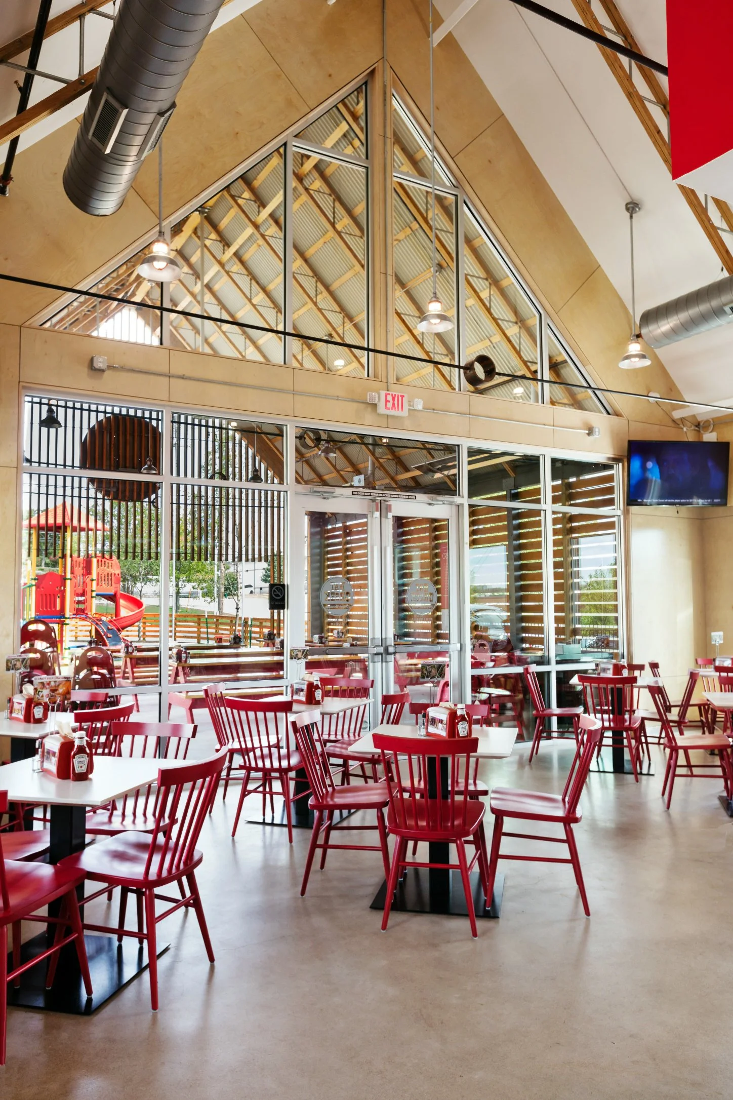 The sixth project with Hat Creek Burger Company was to design a prototype store that could be the basis for a quick expansion into new markets. The first prototype to be constructed was the Lakeway location. The prototype's signature space is a shout-out to the original Burnet location with a vaulted outdoor dining patio that opens to the playground.